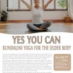 I will be offering a workshop on Kundalini for the Older Body at Yoga West in Vancouver on August 23rd, 2025. Click here to see the details of last month’s workshop. In August, we’ll be working through the Kriya for Elevation.